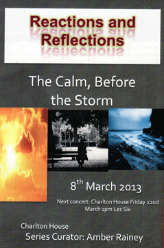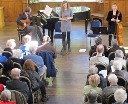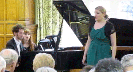 Reactions and Reflections - Les Six Bethan Langford (mezzo-soprano) Megan Quick (mezzo-soprano) Timothy Connor (baritone) Justin Snyder (piano) Charlton House, 22 March 2013 This was a more difficult programme for regular listeners to Amber Rainey's series mainly because translations were not provided and the repertoire was more esoteric. See full review from BachTrack PGW Barber, Poulenc & Britten Claire Candy, Alessaandro Fisher & Harriet Kirk [L to R below] with Ricardo Gosalbo (piano) 8 March 2013 A marvellous vocal recital, one of a series curated by Amber Rainey of the Guildhall SMD. Theirs was a strong programme, facilitated for this audience by Amber Rainey's introductions (and page-turning !) and by the provision of English texts for all three of these important cycles. All the singers were excellent, as was their pianist. There was the usual near full house as we have become used to at Charlton, but it amazed the musicians, as did the wonderful acoustic of this prime venue, to which all the experienced singers adjusted perfectly. None of them overwhelmed us as had Dušica Bijelić