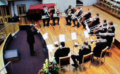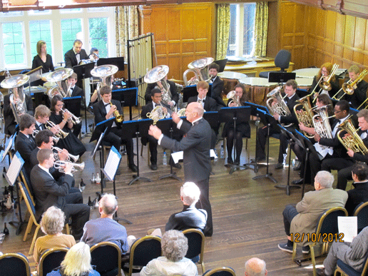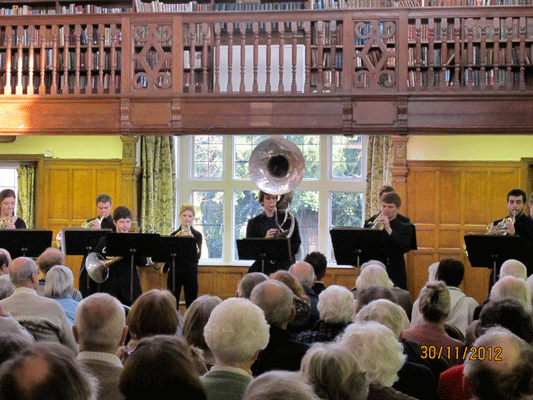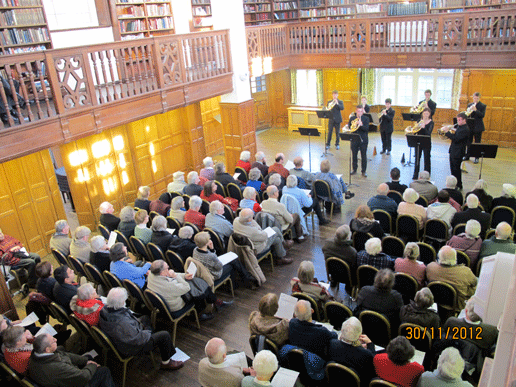 Beethoven, Barber, Grieg, Strauss etc Academy Horn Ensemble/Michael Thompson Charlton House 1 p.m. 30 November 2012 This student ensemble played with a will, taking risks, and it was fun for those who were not too perfectionist; a reminder that until the time of Denis Brain, broken notes from the horns were regular in symphony concerts. The horn is the most fickle of orchestral instruments and this large ensemble of experienced and less experienced students (maybe the whole RAM horn department?) gave us a lively concert, but not really one fairly to be videoed and recorded. Beethoven's Egmont overture, with which they began, features the horn, so it was interesting hearing them cope with the whole score, rather well. However, it attracted the largest audience yet crammed into the Old Library. The Richard Strauss piece Feierlicher Einzug der Ritter des Johanniter-Ordends (say that again?) was We all enjoyed ourselves as I hope you do my photos ! Where else outside a city centre can a comparable venue boast such a large and loyal regular lunchtime audience? Peter Grahame Woolf