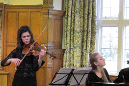 Regent Hall, Oxford St. W1 2 November 2012 A couple of weeks or so on, and Stephen Maw [see him above conducting at Charlton House] was to be seen at Regent's Hall, greeting some 70 arrivals seeking an hour's peace amongst the Oxford Street About fifteen trombones from RAM, in various groupings, made a bright, cheering sound in this excellent acoustic, with no lack felt by the absence of trumpets (which can be overwhelming and bad for the ears - q.v. Greenwich Band review immediately above!). May I be forgiven for mentioning that my small son broadcast and made an LP of Stravinsky's The Owl and the Pussy-cat (his final composition, setting the first English verse to be memorized by his wife Vera) and that Simon's younger brother became a trombonist in the National Youth Orchestra... Peter Grahame Woolf Brahms, Shostakovich, Stravinsky etc Isabel Villanueva, Viola. Oxana Shevchenko, Piano Charlton House, 23rd November 2012 Before that the mostly elderly audience had listened with rapt attention to Stravinsky's Elegy for solo viola and, earlier, everyone enjoyed Isabel's impassioned account of the second Brahms sonata, in which her partner went a bit wild coping with the Charlton House piano, which was not in best condition. An exciting event, which MP's readers and Charlton's "silver surfers" ["riding the crest of the internet wave"] could follow up afterwards by watching on YouTube both artists in Bartok; also Isabel in Gubaidulina's double-viola concerto Two Paths. PGW