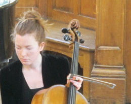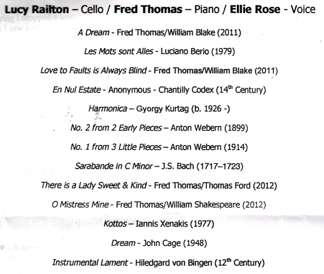 Berio, Kurtag, Webern & Xenakis etc Lunchtime concert, Charlton House, London, 24 February 2012 An interesting, stimulating and contentious programme put on at short notice. Songs by "multi-instrumentalist, composer and arranger composer" Fred Thomas (guitar & piano) were soothing with Ellie Rose's delicate voice, very slightly amplified. More stimulating were short pieces by Berio, Kurtag & Webern; nothing to frighten the horses there until the surprise cello solo of Xenakis' Kottos [Lucy Railton, below] a rough and quite lengthy modernist classic from 1977, which will have been unfamiliar - uncompromising (and shocking) - to most people there... Congratulations on innovative programming which sent Charlton's large captive audience out arguing about whether they'd liked what they'd heard...