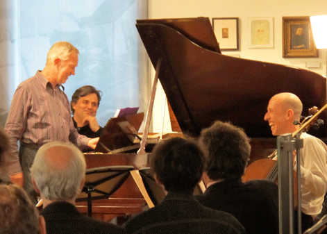 To celebrate the 150th anniversary of the birth of Claude Debussy, writer & pianist Roy Howat [standing] was joined by Peter Sheppard Skærved [violin] and Neil Heyde [cello, R] for a public seminar exploring the young composer’s first essays in the field of chamber music: the Piano Trio of 1880 and two cello pieces of 1882. This workshop was spontaneous and natural, talk amongst themselves, with the audience privileged listeners, enjoying quite esoteric discussion and alternative playings of controversial passages. It provided a window into the mysteries and attractions of research detective work and analysis of findings. The musicians/academics illustrated the complexities and challenges of preparing Roy Howat's forthcoming new edition for the Oeuvres completes de Claude Debussy, demonstrating to the most receptive of us how editorial rethinking can sharpen our perception of these still little-known works, and of Debussy’s skills as a young composer, very different from the familiar one of his later life. A rewarding afternoon, as are so many at RAM, which attracted some 70 people to pack the piano gallery. q.v. Howat's 'The Art of French Piano Music' Yale University Press Peter Grahame Woolf