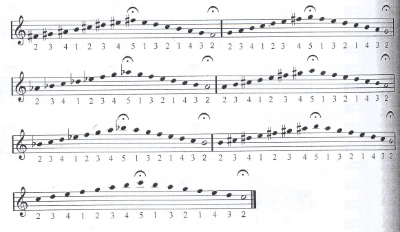 Here are a few fragments from the exercises to illustrate Feuchtwanger's systematic fingerings for developing flexibility in scales and passage work [Editor]: