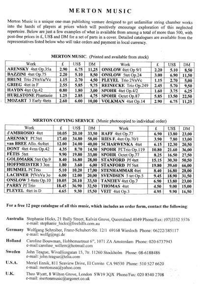 MERTON MUSIC An interview with Theo Wyatt by R H R Silvertrust (2004) (Originally published in the Journal of the Cobbett Association) Merton Music is a remarkable operation. It is run from one room of a London suburban house by Theo Wyatt, a retired British civil servant aged 83, with help from his wife Kitty who sets some of the titles on the computer and from a friend, Bob Horsley who helps with collating. Its prices, a standard 10p. or 20¢ a page post-free, are only a fraction of commercial prices; it has a turnover approaching £20,000 a year; and it has receiving agents in Australia , Germany , Holland , Sweden and USA .. I wanted to know how it was done; how this impressive collection of music had been put together; and whether there was scope for other music enthusiasts to take a hand in making easily available to players the enormous amount of music that is still neglected and inaccessible. So I asked: RHRS What made you start publishing neglected string chamber music? TEW I had been publishing recorder consort music cheaply since 1983 using a mimeograph process. I transferred that business to my daughter in 1995 wrongly interpreting a coronary by-pass operation as a signal to slow down. It was in fact a signal to speed up. RHRS Did you follow the same policies with string music as with recorder music? TEW With my strong anti-capitalist instincts I was always determined to defy commercial conventions. Rock-bottom prices just high enough to avoid the risk of financial loss and perhaps provide a modest supplement to my pension; no advertising; no discounts and no retail sales; no royalty payments for copyright material; and definitely no expansion beyond what one man with voluntary help could achieve in one room. RHRS How did you assemble such a large archive and still keep prices low? TEW This is what I find truly miraculous. I have not had to spend a penny on buying music. The originals on which the archive is based have in a few cases been gifts but in most cases freely lent. RHRS You must have an enormous circle of generous friends? And why do you think they have been so generous? TEW Friends have certainly helped; and in the little booklet Merton Composers I pay tribute to some of them. I think they were generous because they recognised a degree of altruism in the Merton concept and responded to it with altruism of their own. However the bulk of the archive came from two very large private collections. The first of these was the Hawkins Library belonging to the London Chamber Music Society which runs the series of concerts formerly known as South Place concerts. There is a long article in Cobbett's Cyclopedic Survey about these concerts whose history goes back to 1887. The library was the creation of Frank A. Hawkins who had been Treasurer of the concerts for many years and bequeathed the collection to South Place on his death in 1929. Martin Lincé, a former pupil of mine, is its current custodian and gave me access to it. It contains in all around 2000 works. There are 200 for piano solo, 350 for piano duet and 250 for violin and piano. I was interested primarily in the string quartets of which there were around 350. The great majority of these were obviously the standard classics, but even when I had eliminated all of these, and all those still in copyright, and all of those non-standard works available commercially, I was left with some 60 works. I am still laying the Hawkins Library under contribution and have just collected 31 piano trios, 20 piano quartets and 15 piano quintets, all unobtainable commercially, which will appear in the 2004 Merton catalogue. There were some disappointments. There was, for example, not a single quartet by Onslow or Spohr or Vanhal or Krommer despite the vast output and enormous popularity of these composers in their own day; but the reason for this is now clear to me. Frank Hawkins was not an antiquarian collector. He acquired only what the commercial publishers made available in his lifetime, and in his lifetime none of their works was in print because in the brave new world of the emerging 20 th century they were all regarded as hopelessly old fashioned. In this respect the coverage of the Hawkins library was very similar to that of the ill-fated Chester Library. What must impress anyone who handles Hawkins music is the extraordinary care he devoted to its preservation. Every part has its own stiff buff cover into which the pages, reinforced down the centre fold with a carefully glued fabric tape, are then stitched with stout green twine. Every set of parts has its own specially made stiff cover. And all are graced with details of the work applied by rubber stamp, which Frank obviously wielded with schoolboy enthusiasm. This does have one drawback: the original title pages, which are sometimes masterpieces of the steel engraver's art, have usually disappeared. The parts are scrupulously free of fingerings, bowings and other markings. But what also impresses is how well some of them had been used. I used to aim to test a work's attraction by playing it myself before deciding whether to put it into the catalogue. With some works this was hardly necessary - you could tell instantly from the thumb dirt on the bottom tight-hand corners that this was a well-loved work. What you could also tell from indirect evidence was that the drawers or cupboards in which Frank stored his library were only 12¼ inches deep. Everything longer that this had been guillotined, always at the top, sometimes unfortunately carrying away the page numbers and the instrument name. I was still digesting the Hawkins bounty when I heard through friends of another hoard. This had been collected by Harry Brown, a mildly eccentric viola player referred to (behind his back) as Uncle Bulgaria from his resemblance to that Wombles character. I met him only once when asked to join a Raff octet at his house in Wandsworth. He worked for the Midland Bank and used its ledger sheet