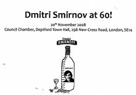 A pleasant evening for Dmitri Smirnov was organised by the Russian Department of Goldsmith's College. In pre-concert discussion the different atmosphere for composers in Soviet times and Russia now was explored, as well as the position of ex-patriate composers settled in UK.