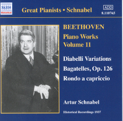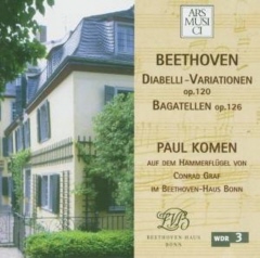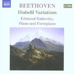 This is an interim report to welcome three recordings of one of my favourite musical works, one which I should have to be include in any listing game of top dozen etc (maybe readers would be interested to think about theirs, for a future compilation article at Christmas?) Whose is your favourite Diabelli and why? Please write to tell Musical Pointers. Schnabel's account from 1937 (the first recording ever) is a benchmark must for serious collectors. He never fails to engross me, and the Op 126 Bagatelles was one of my treasured sets of 78s back in my youth. Edmund Battersby's double CD for Naxos is a landmark in the Diabelli's recording history. In one inexpensive package, you can hear it on a modern copy of a Graf from Beethoven's time and for comparison on a modern Steinway. We were thrilled, finishing restored and exhausted after listening this evening to the fortepiano verion straight through, not comparatively as planned for reviewing. My first reaction is that Battersby is so compelling on his own fortepiano that the other disc might be redundant. I've got to the state now of thinking of Steinway performances of classics & early romantics as 'transcriptions'! Battersby tantalises us with his discoveries in the course of the project; he found the music - - 'less abstract & more instrumental - - unveiled enhanced possibilities on the modern piano' etc. There was plenty of spare space on three of the English language pages in the booklet for him to have vouchsafed us more detail about that? For the time being, I urge readers to acquire the Battersby double, superbly close-recorded for home listening. It carries a thoughtful track-by-track analysis for listeners by Lia Jensen of the University of Nebraska-Lincoln. [Fuller review by Elena Vorotko, see below.]