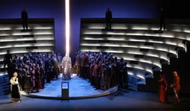For Act 1 we are in a tribunal or parliament. Elsa stands in isolation, mental as well as physical, as she ignores the charges and describes her dream of the shining knight who is to save her. No swan appears in this production, just a blinding shaft of light from amphitheatre to stage floor through which Lohengrin appears – and throughout he and Elsa are surrounded and set apart by a magical silver light.