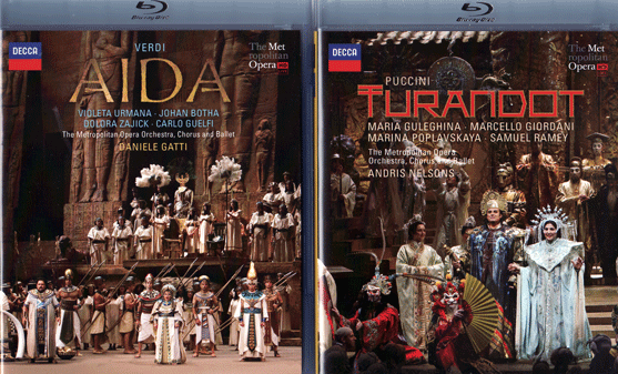 Verdi Aida & Puccini Turandot Decca 074 3427 Aida These two HD blu-ray Met Opera spectaculars were received for review together, both well produced on blu-ray DVDs and with good sound. We rather soon gave up on the Aida because of the wooden acting and singing which failed to engage us. The production is inescapably redolent of Cecil B de Mille blockbusters, with crowd scenes that soon palled with repetition.