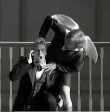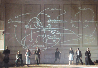 Eros a seductive non -speaking/singing young man dressed in school boy uniform with cherubic wings running around trying to manipulate all the characters" [Magyar The Universe]. Several years on, radical re-thinking and updating of opera has become de rigeur, and these pioneering Salzburg innovations are certainly worth revisiting, flawed though some of them be. But this Figaro is a must for everyone who cares about Mozart the opera composer. Peter Grahame Woolf - see screenshot L of final tableau, Cherub/Eros (centre) having elucidated for us (?) the confusions in the great Act 2 Finale ! |