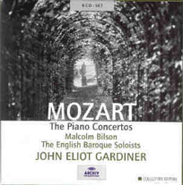 - - for the piano concertos, in my book Malcolm Bilson has no peer in the huge Mozart discography. His recordings with John Eliot Gardiner (c.1990) are reissued in a no-nonsense compact box, 9 individual slip-cases with a very full 112 page fully illustrated booklet, with a wide range of essays by experts. The particular virtue of these recordings is the true balance achieved by engineer Karl-August Naegler who does not attempt to disguise the quietness of the solo instruments (Walter/Belt and Walter/Adlam) as against the orchestra.* Malcolm Bilson's set of the mature concertos was later supplemented by recordings with the American Classical Orchestra of seven more early concertos which had not been included (and now he's the one in large print!)... The earliest of them are the Pasticci K. 37-42, every movement stemming from a different work by another composer, compiled with close collaboration between the child Mozart and father Leopold. They are charming and well worth having, here in a double CD, originally from MusicMasters 1993-94. Warmly recommended to everyone and essential for Mozart completists. Peter Grahame Woolf *Malcolm Bilson's Mozart concertos have been recently challenged by Viviana Sofronitsky for the Polish Dux label. |
