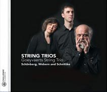 Goeyvaerts String Trio Listeners will have various reactions to this CD and its programme of music from 1927 to 1985. The presentation is peculiarly defensive. About the earliest music, Webern's, it seems almost to glory in reminding us that an eminent British cellist, James Whitehead, best remembered now for having'50s, walked off the Wigmore Hall platform saying "I can't play this thing - a nightmare - not music at all, but mathematics". In refutation Elise Simoens divines that Whitehead was "obsessing on the work's extremely high technical-composition level"... And to bolster up the disc for sceptics, Channel Classics includes a 1949 broadcast defence of the Schoenberg trio from the composer himself. So, what is the prospective listener to think? Firstly, to music lovers with open ears I would recommend purchase. And perhaps that nervous ones should play all this music in a different order than the track listing. Webern's posthumous movement (only two and a half minutes) reconciles sonata form with dodecaphony in a way that shouldn't frighten the horses, and it will introduce you to the refinement of the Goeyvaerts String Trio's playing. Next, perhaps the Schnittke Trio, the most recent. But because it consists of two long slow movements, take them one at a time. The first is extremely beautiful, and I've never heard it more so than from these players. It's general mood is sad to tragic, and that goes for its second So go next to the Schoenberg trio, in a single movement with multiple sections, 3 Parts and 2 Episodes. With a variety of extreme registers and playing techniques (flageolet, col legno, pizzicato and sul ponticello) there is more than enough to engage the ear. The notes may be "wrong" for listeners wedded to tonality, but the whole is intriguing and, dare I say, beautiful. There is another good account of the trio in Naxos' budget Schoenberg series - "one of Schoenberg's most haunting and satisfying works, once one has got inside its uncompromising language." Time to tackle Webern's 12 minutes of high density twelve-tone rigour. I still find it tough and uncommunicative after several hearings and will probably never learn to love it (but at least it isn't an impenetrable morass of inchoate sound like Ferneyhough's touted La terre est un homme). So, to conclude a stimulating hour's listening, finish with Schnittke's Adagio, deeply felt and coherent, addressing in music the composer's cultural isolation under the Soviets. Then, next day you may be ready to hear it all again in the listed order... There are few reviews to be found; musicweb-international's is generally positive but with reservations about the actual performances and their sound which I do not share. On new equipment - Sony home cinema CD/DVD player - (a factor often ignored by reviewers and rarely disclosed) it sounded fine and by no means lacking in feeling; there are sound bites at the link above top. I doubt if there will be a rival for this intelligent programming, so do try it. Peter Grahame Woolf |