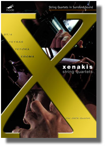 Xenakis Alpha & Omega CD1: Metastasis, Diamorphoses, Concret PH, Analogique A et B, Orient –Occident, Morsima-Amorsima, Nomos Alpha, Anaktoria Accord: 4804904 (4CDs) For Xenakis enthusiasts this is a convenient compilation of historic early recordings (1950s-1990s), all of good quality, and reminding us of famous pioneering artists of the time: Siegfried Palm, Octuor de Paris (they gave 150 performances of Anaktoria !), Les Percussions de Strasbourg, Geoffrey Douglas Madge, Claude Helffler, Roger Woodward, Elisabeth Chojnacka et al. Listeners will have varying perspectives; I'm least interested in the tape compositions and in the daunting theoretical background of this one-time architect. But the variety of (then) new sounds he invented has had enduring effect upon composers since; a sound revolution, like it or not... My own preferences have included Nomos Alpha for solo cello, Aroura for 12 strings, Persephassa for six percussionists. This boxed set should certainly find a place on college/conservatory contemporary music library shelves. ST-4/1,080262 (1956-62) (12:56) The Jack Quartet mode DVD 209 But for the ordinary enthusiast, consider first a sensational DVD of Xenakis String Quartets complete (the CD has been reviewed at http://www.musicalpointers.co.uk/reviews/cddvd11/Xenakis-quartetsKurt%C3%A1g-forviola.html.) This music is very physical, and the DVD version is definitely to be preferred. ST-4/1 is a computer generated score, which will hold its clues from non-mathematicians... Tetras is perhaps the most attractive, with unison playing featuring prominent double-stop glissandi, percussive noise effects etc. Tetora has none of those Xenakis hallmark glissandi; instead it features his "sieve" treatment, all in "steely non-vibrato"... Tim Chu's extremely imaginative filming adds another dimension to the experience, and was far preferable to the live performances by the Jacks in the incongruous Wigmore Hall last month. Peter Grahame Woolf