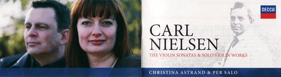 Maurice Ravel (1875-1937) : Violin Sonata in G major Ernest Bloch (1880-1959) : Violin Sonata No. 2, "Poeme Mystique" Leos Janacek (1854-1928) : Violin Sonata JW VII/7 Christina Åstrand (violin) Per Salo (piano) Orchid Classics ORC100022 (DRSO’s Concert Hall, May 2012, CD + DVD - price as one) This is a remarkable - indeed, to my knowledge unique - recording project from the leader and pianist of the Danish Radio Symphony Orchestra. Both are, unsurprisingly, superb musicians and chamber music partners. They give exemplary accounts of three important 20 C violin sonatas, two of them increasingly well known and admired, Bloch's less so. What is special is the visual treatment of the DVD, superbly filmed in Blu-ray quality definition, thought they are not Blu-ray filmings and will play on any DVD machines. The recordings were made separately, the CD in February 2011 at Studio 2, Danish Radio, Copenhagen; the DVD the following November at the Concert Hall there, to spectacular result. The sound for both is in the safe hands of Aksel Trige, the elaborate, innovative filming under a team headed by Arne J Rasmussen. What is new (to me) is that there is no conventional cutting for close ups etc; instead, the camera(s) move freely around, pointing the strikingly contrasting lighting of the hall and the different costumes chosen to perform each work (nothing to be frightened of there!). None of this comes over (to us) as gimmicky; the fluid movementss of focus reflect the music in a way which gradually takes over - I was at first worried by the transient elongation of the Fazioli grand but quickly accepted it. The filming took place in the marvellous new Copenhagen concert hall and these musicians, who play there regularly, have deliberately given each work a separate visual imagery, which complement each other. I have concentrated on the presentation, but have no doubt - each performance is competitive and these modern digital accounts have nothing to fear from comparisons (Gramophone 1958 reviews early performances of the Bloch, including by Heifetz, and ASV has Friedman c. 1990). If the idea of the special visual treatment puts you off, there is always the CD sound-only performance of the programme to enjoy. Christina Åstrand & Per Salo leave me eager to hear their other recordings of Nielsen, Norgaard etc. Peter Grahame Woolf Nielsen music for Violin and Piano Christina Åstrand & Per Salo I first heard music by Nielsen around 1951, at Robert Simpson & Harold Truscott's Exploratory Concert Society which met in London's Regent Street, and to which I was a devotee - and have remained a musical explorer ever after, as the listings in Musical Pointers will substantiate. Nielsen's 2nd violin sonata made a lasting impression, with its strange marking "con tiepidezza" and the bizarre, unpredictable "allegro piacevole" finale, which stuck in the memory ever since. I may however not have actually heard it again until kindly receiving this valuable CD, in which the duo provide the whole of Nielsen's oeuvre for violin and violin/piano duo. PGW See also http://www.musicalpointers.co.uk/reviews/cddvd/NielsenViolinStrings.htm