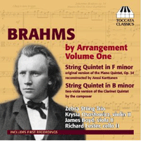Brahms arr. Karttunen etc Reconstructed original version of the Piano Quintet, op.34; Krysia Osostowicz, Ernst Kovacic, Violins; Toccata Classics: TOCC0066 An enterprising disc, with another to follow. Particuarly valuable notes; a musicological document by the distinguished and prolific Malcolm MacDonald. There was a previous reconstruction of the piano quintet string quintet first version, which Karttunen didn't know when making his own very different one. Plenty for study! Fine UK freelancers of the highest calibre. Peter Grahame Woolf
