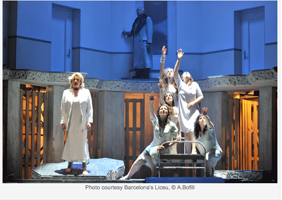 Hers is a demanding role, needing a Wagnerian voice, and Yvonne Naef does it full justice, supported by her faithful companion Liliana Nikiteanu, who only just succeeds in escaping from the seductive trap of complete dependency, to return with Ariane to the world outside at the last moment. The institutionalized wives, kept in penury in underground cells, are pictured to suggest deprived inmates of the worst psychiatric or social facilities, twitching with obsessive movements and reverted to childlike dependency, and they fulfil their individuated roles admirably. Dukas' orchestration is sumptuous and dense, and made an overwhelming impression in Zurich's compact operahouse, notably with the dark timbres of low wind and brass. A recording by these forces (preferably on DVD) is urgently hoped for *. This is an important opera, entirely new to us, which can be seen at Zurich until 13 February.