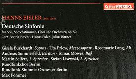 This has been received for review; an impossible task for a non-linguist with not a word other than German to be seen; I guess that will apply too to the 30 other discs advertised on the back three pages of the slender booklet? Surely the Brecht text (available in English on another recording) could be put out as a .pdf, if nothing else? Then, I'd review it! The three orchestral sections (half of the whole) sound great! PGW Meanwhile read this Amazon review: - - this is one of those cases where you might not realize you were listening to one of the great works of the 20th century if you heard the wrong recording - - The power of the work is lost without Brecht's great poetry, and this Berlin Classics disc has only German. So if you take my advice and buy this disc, you are going to need to find the libretto somewhere! RH |