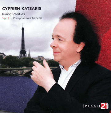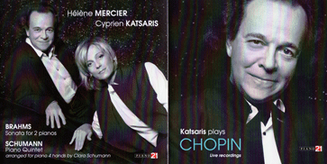 Cyprien Katsaris Collection Marvellously varied additions to my vast and still growing precious Katsaris Piano21 collection, which has held a pride of place in my CDs/DVDs library for some years, particularly since September 2011 Sadly, efforts to achieve a review of that reportedly very successful recital, his first in UK for many years, proved unavailling, as have been repeated attempts to interest UK agents to promote Katsaris for UK recitals in England by his UK recordings distributor and by myself; similarly for fine specialist pianists such as Stephen Clarke, Ralph van Raat & Viviana Sofronitzki - to name but three. One of those summarised our insularity thus: Each of these Katsaris discs is a very different and very personal, with many of the tracks not duplicating other recordings. There are illuminating notes, those for the French pieces especially, from fellow pianist & friend Christian Lorandin. Please see the comprehensive review at Audiofile Edition, which reflects exactly my admiration for this compilation. The Chopin live selection has many favourites and less familiar works, including solo piano transcriptions from the cello sonata and piano concerto No 2, taken from performances and broadcasts world wide, every item fully documented. A joy from beginning to end. The two duo-pianist arrangements of established chamber music favourites are sensational. The Schumann Op 44 quintet was arranged for piano 4 hands by Clara Schumann. She was also closely involved at all stages in the fraught reconsitution of Brahms' string quintet via this two-pianos version to its eventual form for piano and string quartet. The partnership of Katsaris with Hélène Mercier is ideal and if Brahms had been able to hear this recording, I wonder if he would have felt it necessary to re-arrange it for piano and strings? Peter Grahame Woolf Piano Rarities - Cyprien Katsaris Piano Rarities Vol 1 A fascinating disc of transcriptions of music by various composers, mainly by Karol A Person (who is also a Professor of Physics !). Excellent comprehensive notes by Christian Lorandi. Piano21 030-N French Piano Rarities Piano 21 P21 037-N Schumann/Brahms - works for Two Pianists Brahms: Sonata for 2 pianos in F minor, Op. 34b Schumann: Piano Quintet in E flat major, Op. 44 arranged for piano 4 hands by Clara Schumann & Cyprien Katsaris (piano) Chopin Live - Cyprien Katsaris 1 Prelude in D flat major, op. 28 no. 15, “Raindrop” 2 Prelude in C minor, op. 28 no. 20 3 Prelude in B minor, op. 28 no. 6 4 Prelude in A major, op. 28 no. 7 5 Prelude in E minor, op. 28 no. 4 6 Souvenir de Paganini 7 Polonaise in C sharp minor, op. 26 no. 1 8 Fantaisie-Impromptu in C sharp minor, op. 66 * 9 Wiosna in G minor, op. 74 no. 2 10 Contredanse in G flat major 11 Valse in A minor, op. 34 no. 2 12 3 Ecossaises, WN 27 13 Largo (from Cello Sonata in G minor, op. 65) Transcription: Alfred Cortot 14 Etude in C minor, op. 10 no. 12, “Revolutionary” * 15 Etude in E major, op. 10 no. 3, “Tristesse” * 16 Mazurka in B flat major, op. 7 no. 1 * 17 Allegretto 18 Mazur 19 Mazurka in G major, op. 67 no. 1 20 Mazurka in G minor, op. 67 no. 2 21 Mazurka in C major, op. 67 no. 3 22 Mazurka in A minor, op. 67 no. 4 23 Nocturne in G minor, op. 15 no. 3 24 Nocturne in E flat major, op. 9 no. 2 25 Nocturne no. 20 in C sharp minor 26 Larghetto (from Concerto no. 2 op. 21) Arrangement for piano solo: Frédéric Chopin Piano21: P21 037-N; 043-N; 044-N See Katsaris Piano21 CDs & DVDS |