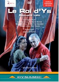 First premiered in Paris in 1888, Le Roi d’Ys was an immediate success, with its Act III Aubade (Vainement, ma bien aimee, on croit) remaining a hit, which no tenor* could afford to omit from his repertoire, for many years. Opera was very much at a turning point at that time. Verdi was coming to the end of his career and “grand opera” was being replaced by the opposing strands of Wagner’s epic sagas and the modern realism of the “verismo” movement. Somehow Lalo managed to combine elements of both; his story derives from Breton legend, but his characters are very much flesh and blood people. Indeed the role of “bad sister” Margared is amongst the great villainesses of the operatic stage, plotting against her country and finally hurling herself to a cataclysmic death. Lalo was also a very good tunesmith, giving each of the principals fine arias and ensembles, and the chorus has some very lively moments. The story is coherently handled and, whilst the resources required to stage the piece are not insignificant, this opera deserves regular performance. Whatever its merits, and although it must be somewhere on the Opera Holland Park long-list, it now seems to be firmly consigned to the “rarities” category. This makes the recent recording welcome, doubly so, since it is available in both CD and DVD format. The casting is very strong throughout, and the staging is on the whole exemplary. I do have a quibble with the first, formal court scene in which the chorus sing a celebratory ode to the royal party. Whilst the royalty, who are not required to sing at this time, are perfectly sensibly seated on raised thrones at the centre back of the stage, this forces the chorus to face upstage, with their on-stage conductor part of the action, and the sound of their voices is horribly muffled. If you are listening on CD, this is the first singing that you hear, and the poor sound quality is certainly off-putting. I have already mentioned the pivotal role of Margared. On this recording we have the mezzo-soprano Giuseppina Piunti who is a fine actress who is not afraid to let an ugly tinge into her voice to reflect the drama of the piece. Again, I think this works best when sound and picture are united, and my recommendation would certainly be to acquire the DVD, which also has the benefit of sub-titles. (No libretto is boxed with the CDs although attention is drawn to its availability on-line at the Dynamic website) For those who have a preference for CD, there is a choice, as what must now be regarded as a vintage recording under Pierre Dervaux dating from 1973 remains in the catalogue (Gala GL 100.599). The sound quality is clean, with Margared being none other than Jane Rhodes, chiefly remembered for her incomparable Offenbach roles, but effective in this darker mood. 47 minutes of Bonus Tracks are included featuring historical recordings of arias from the opera, from 1920-47. Serena Fenwick * Not only tenors – Melba famously jumped on the band wagon, recording it for HMV (DB.354) “(She) lends it delightful charm”. |