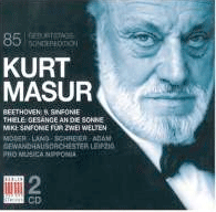 Masur at 85 - concert from 1981 Beethoven: Symphony No. 9 Miki: Symphony for Two Worlds Thiele, S: Gesänge an die Sonne Gewandhauschor & Gewandhausorchester Leipzig/Kurt Masur Thiele, Miki & Beethoven Berlin Classics 0300439BC This is an impressive double CD of a historic concert in 1981, inaugurating Leipzig's new concert hall, and released for Masur's 85th birthday. For British collectors (we are notoriously poor linguists) there are serious drawbacks in the presentation. The track-listing is awry because there is an extra track inserted for applause after the important Thiele premiere. There are no English translations, a serious lack in the case of Siegfried Thiele, who is little known over here; his Song of the Sun sounds fine, with a special part for the organ. The texts by Goethe, Schiller and Holderlin are out of copyright, so maybe Berlin Classics could, at the least, put them on their website, pending re-printing of the booklet, which carries an important essay about conditions in the GBR at that time and the difficulties for Masur in promoting the work Thiele in the political context of the time. Minoru Miki's Symphony for Two Worlds is a successful "cultural dialogue" for symphony orchestra and the musicians of Pro Musica Nipponia. I haven't heard this Ninth, but am confident it will be worth setting aside time for it. Peter Grahame Woolf q.v. e.g. Kurt Masur's live 1981 reading of Ludwig van Beethoven's Symphony No. 9 is comparable with many mainstream interpretations of its time, and may be regarded as a reasonable choice among the affordable CDs put out by Berlin Classics. |