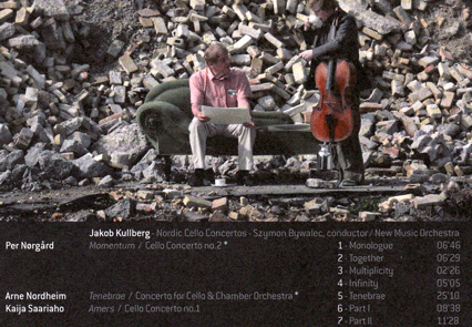 Nordic Cello Concertos Jakob Kullberg (cello) Aurora:ACD5075 This is an extraordinary and extraordinarily important CD. Three concertos, each both accessible and beyond doctrinaire modernism. Nørgård's was conceived and developed in close association with this marvellous cellist (the second movement a wedding present for Jakob). It takes the cello from the centre, through mutual copetition to "plural simultaneity", culminating Nordheim's concerto is "a dramatic, sombre service", dealing with suffering, love, loneliness, death and darkness - culminating in explosions communications "the uncontrollable and overwhelming". Saariaho introduces electronics, and treats abstractly of Sea, Space, Light and Sound, with cello improvisations in the first and last movements. Produced and annotated in a thoughtful insert booklet (strong black on glossy white), this is a disc to hear again and again. One caveat; the information on the back cover, illustrated, is miniscule and hard to read - grey on black, sinful ! Peter Grahame Woolf