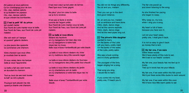Poulenc was versed in literature and astute in choosing texts to set to music, as was his English friend Benjamin Britten. There are twenty-nine Poulenc choral songs, by poets including Appollinaire, Éluard, Ss. Francis of Assisi and Anthony of Padua, together with a large selection of anonymous French songs, many of those delivered at breakneck speed by the marvellous Danish Choir under English conductor Stephen Layton. But here the French words are separated from their English translations, so that the only way to follow them whilst listening required ripping the booklet apart and trying to align the pages [q.v. pp 22 & 31 below] ! If it is too late to withdraw this CD before it reaches the shops, I suggest that OUR Recordings hastens to put all the texts, arranged in proper parallel format, onto their website, with a note that they have done so to the record shops for purchasers. The booklet should be returned forthwith to graphic designer Charlotte Bruun Petersen for radical rethinking; to my own taste texts are always better black on white, rather than on pink and dark blue (which makes reading harder for some listeners). Adjustment of font sizing and line spacing should make an easy job for her. Failing that possibility, bi-lingual texts should be offered on the excellent "OUR recordings" website? My strictures are offered in the sincere and friendly hope that they will be adopted and turn around a flawed release into a triumph. Peter Grahame Woolf |