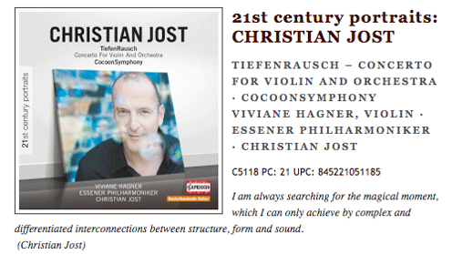 A discovery! This German composer (b.1963) has been featured in Wales by Jac van Steen and the BBC National Orchestra of Wales and by Ivan Hewett on BBC R3 (nla). His music is strong in direct appeal in each of these two works, and the complex structural approach can be taken on trust. The liner notes conversation with Stefan Lang is more about feeling and mood than technicalities. Apparently he is concerned with "the shadowy underside of human nature" but I don't think that needs to worry you or should put us off unduly. Two big works of striking originality, which want to be heard twice, double the 47 mins whch might seem short measure. Watch out for next opportunities or take a chance with this Capriccio CD which I treasure. There's little to be found yet on the internet other than from Schotts, his publisher... Peter Grahame Woolf |