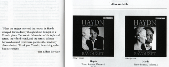 Haydn: Piano Sonatas Volume 5 Jean-Efflam Bavouzet (piano) Sonatas No. 15 in E major, Hob.XVI: No. 12 in A major, Hob.XVI: No. 37 in E major, Hob.XVI: Chandos 10763 Now Haydn has really come into his own with intégrales of the symphonies from Esterhazy, and two wonderful recordings of the piano sonatas, from Tom Beghin on fortepianos (absolutely not to be missed) and Bavouzet's well under way on a modern Yamaha: Others by eminent main stream pianists have left me dissatisfied - many on Steinways: Bavouzet's tone quality as recorded at Potton Hall is ideal and his is the modern piano set to be recomended above all others, "done with notable attention to clarity and texture: Bavouzet's articulation and scrupulous pedalling feel always in style, never anachronistic" [International Record Review]. I have only caught up with them belatedly and look forward to the boxed set which will surely follow completion of the project. Peter Grahame Woolf |
