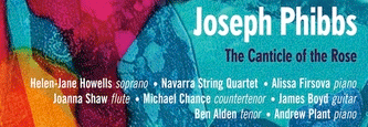 Phibbs: The Canticle of the Rose Helen-Jane Howells, Navarra String Quartet, Alissa Firsova, Joanna Shaw, Michael Chance, James Boyd, Ben Alden, Andrew Plant NMCD191 An interesting portrait disc in NMC's Debut series, with good performances by various chamber groups and by singers Ben Alden and Michael Chance. I was less taken by the longest and title item and with the singing of Helen-Jane Howells to Joseph Phibbs is a director of The Britten Estate Ltd. and I guess some of his music will been given at Aldeburgh; certainly it would sit well with Britten's own. There are no recording details (other than in the caption L) nor about the artists. Peter Grahame Woolf |