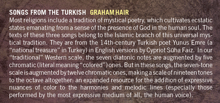 This new CD is a state of the Art production, slimline with "liner notes", texts (essential) and full scores all accessible only on your computer. If the latter (upstairs) is in a different room from your best listening equipment as mine (downstairs), there are snags, but I s'pose we'll have to get used to them and adapt. If you're not too keen on the sound of four shrilly interweaving high soprano voices, you'd do better to sample first Hair's Turkish Songs for just one soprano, clarinet and digital harmonium. All the scores are there for your study too, sharp and clear; this disc is therefore recommended as essential purchase for people who want to be "with it". Navigation is quickly mastered. Peter Grahame Woolf