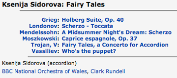 Champs Hill CHRCD055 This is a delightful second CD* by a favourite musician of mine, one whom I have reviewed repeatedly, at Blackheath Halls, the Royal Academy of Music and elsewhere. The selection of works, solo at Champs Hill and orchestral at Cardiff, is satisfying at various levels, and should be perfect for radio disc jockeys. Ksenija Siderova's musicality will convince those remaining few who still think of the accordion as something of an outsider. I don't like Champs Hill's cover photos of her so have preferred to give you one from our review of a Wigmore Hall 2009 recital: The Vaclav Trojan concerto (more correctly Concerto fo Orchestra and Accordion) is a charming evocation of familiar fairy-tale characters with cheerful ebullience and also darker moods suggesting a slithering dragon waking up. Every item, many of them familiar, makes you appreciate it anew under Ksenija's hands. I hope that her next recording might help to establish the accordion in duo with piano, notably successful at Blackheath with her partner Stefan Ćirić, possibly the best experience of all, and the one with greatest potental significance. Peter Grahame Woolf *See our review of Ksenija's first CD, with Berio, Nordheim, Schnittke, Takahashi etc Below: Ksenija Siderova explaining her Pigini "Rolls Royce" accordion on Classic FM and watch her playing a Scherzo-Toccata |