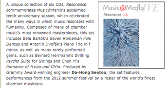 Music@Menlo Live 2012 Running for 10 years, but little known of in UK, this USA West Coast festival is of great appeal and the release of its 2102 programme on disc is strongly recommended to collectors who favour live music making over studio recordings. I have enjoyed 3 of the 6 discs, those which feature some less familiar music from the chamber music canon, and have found each engrossing and full of intensity in performance; vividly recorded by Da-Hong Seetoo, to whom the project's success is substantially owing. The best known names are its directors David Finkel and Wu Han, together with pianist Gilbert Kalisch, but the supporting standard is high, whether from established artists or students. I have been engrossed by high-romantic chamber music such as the Faure's 2nd piano quartet and Dvorak's biggest; the Chausson chamber Concerto; and I've been persuaded that Hermann's scary Psycho Suite is worth concert exposure There is no applause on the discs. To get the atmosphere, try some of the many You-Tube postings, such as a rare Schnittke piece for 3-pianists which rouses the young audience to infectious furore ! PS I have snatched time to sample one of the discs with more regular repertoire, and am pleased to confirm that in no 1, Beethoven's Op 70/2 trio is entirely satisfying; in Schubert Kalisch charms in 6 German dances, and Belman & Pohjonen (neither known to us) are impeccable in the hazardous violin/piano Fantasy inC which, I'd suppose, cannot have been risked recorded live before? Details from www.musicatmenlo.org