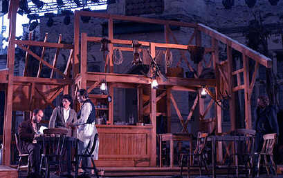 The set is clever, pine trees either side leading out to Holland Park's real ones. The structure turns easily from bar to Minnie's hut, but I was less sure about the ready-made scaffold kit, put together as a by scurrying miners in the pause before the last act. And it was disconcerting that Johnson knew where to climb and seat himself ready to be pushed off into oblivion! A rougher and unready tree, with a branch to sling a rope over, would have been more plausible - but who cares, in Holland Park's splendid tent, with the orchestra on a level with us between audience and action. A great, inspiriting night at the opera.