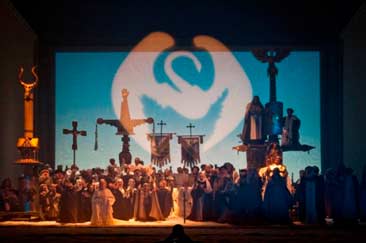 Our vocal specialist being away covering opera in Frankfurt, it fell to a very imperfect Wagnerite to report on this uncut Lohengrin, a revival 3 decades on of Moshinsky's 1977 production. Through the first Act I felt alienated and out of place, my disbelief epitomised by this representation of the Swan above, in an age when every day slick images on TV compound the absurdities of old style opera production, which the sold out matinée audience at Covent Garden took in its stride. In the lavish programme book, John Deathridge tells us that it is in Lohengrin where the 'Music of the Future' begins... More useful is Patrick Carnegy's review of the stage history of this always problematic work, which operagoers enjoy not for its intellectual content but its 'pageantry, processions, fights - - the swan-drawn boat'... (William Mann in The Times, 1971). Lohengrin was one of the first operas I saw, very many decades ago, and I miss the plastic swan being trundled across the back of the stage with a massive tenor nimbly jumping out of his chariot; that's how it should be. At Covent Garden we get fobbed off with a trap door entry and no swan at all for Acting was minimal and the fights perfunctory. Only the sumptuous music delivered in all its glory by the orchestra and star singers, unnaturally overriding it with ease, drew me in and made the experience plausible in the more varied second Act. With Bychov at the helm and the chorus magnificently sonorous one somehow got into the right mood after the first interval and began to enter this Wagnerian world which still holds sway in international opera houses. Being a Sunday afternoon, and the season well under way, all the principals were in fine voice and one accepted that acting was no priority in yet another revival of the tired 1977 production. But the whole thing was like a time capsule at variance with the ethos of today.* Opera Critic assembles ten reviews of this revival and five of Clive Barda's photos. For a Lohengrin of our time, see Musical Pointers' review of Lenhoff's production at Baden-Baden. Peter Grahame Woolf * - - John Napier's designs are so redolent of '70s kitsch as to make one reflect more on the nature of opera production at that time rather than engaging with it as a living piece of theatre today - - it looks old-fashioned, and seems caught in a time warp [Musical Criticism] |