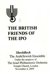 Temple Church, London 4 November 2009 A large audience enjoyed an intermingling of musics from the two traditions, classical Western and classical Arabian. A high point was a Fantasy on Saint-Saens' Samson & Delilah in which ney, kamanja, deff & and Darbuka drum joined with members of the This initiative, albeit smaller in scale than Barenboim's West-Eastern Divan Orchestra, is active in Israel's schools, an important agent for promoting inter-racial harmony and understanding. Shesh Besh has an unique and highly recommendable CD Collective Memory featuring compositions from composers of both communities. Peter Grahame Woolf