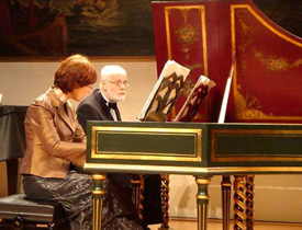 Ton Koopman & Tini Mathot, harpsichords Wigmore Hall, 25 April 2010 This was very much a concert of two halves. The Musical Offering played complete from the Ricercar a 3 (harpsichord solo) to the Ricercar a 6 (all musicians) was an intense and memorable experience. Koopman's ornate harpsichord (unidentified for us) was bright-toned and sounded fine right to the back of the hall. The baroque strings, which carried the main burden of the work, were glorious, each player and instrument with its own character, and their playing showing deep familiarity with this music [they've recorded it on Challenge Classics - CC72309]. This extraordinary achievement of the elderly JSB, composed for Frederick the Great - but way beyond his flute playing capability - was never intended to be performed straight through and is better not so. It demands intense concentration from listeners, and I should have welcomed an interval before the trio Sonata Sopr' Il Sogetto Reale, in which Jan de Winne's soft-toned baroque flute was not quite a match for his colleagues; with the eye to help it was acceptable, but I guess for the CD some balancing correction will have been called for? The second half was something of a disaster. A second simiarly ornate harpsichord was brought on stage for Koopman's wife, Tini Mathot, but they were positioned so that both players were virtually invisible behind their music stands. The lighting was bizarre, with a large standard lamp to one side and a dazzling modern light for the other, and with the accompanying players ranged behind them at the back of the stage; very odd. A repeat performance of the Ricercar a 6 on the two harpsichords was gratuitous; they clattered along with little discernible nuance or phrasing... And the concerto was no more rewarding. It surely was a version of the famous D minor two-violin concerto (not the BWV1061 in C as programmed - hear that one nicely played on two fortepianos by the Labeque sisters) and it made a disappointing finish for the concert. Peter Grahame Woolf Double Keyboards recital Ton Koopman with