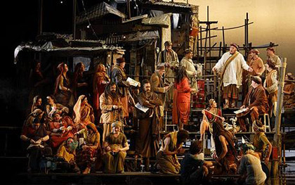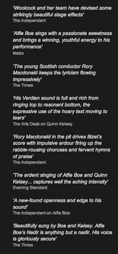 Conductor Rory Macdonald ENO's new Pearl Fishers is eye catching at the start, though its visual impact diminishes with each succeeding scene. The overture has us under water with balletic pearl divers; the curtain rises upon a piled-up, precarious looking shanty town at the water's edge; simulated waves (a hardy old stage effect) billowing around the background, often too enthusiatically for the supposedly calm weather before the storm. The scene is set for a present-day take upon the "Orient" in our culture; how far though is it still a repository of Western fantasies of the Orient as recreation and consumption, the Nirvana for traveller pilgrims in the 1987 production, so close to 19th C "Orientalism"? Penny Woolcock makes a valiant attempt to update this opera into more respectful and pluralistic conceptions. There are more hints at outwardly realistic representations, with a tacit acknowledgment that the balance of power between different cultures has shifted. We Westerners are now expected tp pay for 'taking' something, this shift beautifuly encapsulated in the cameos of Western back-packers paying to take flash photos of the natives; and the residents have to make do with an ancient TV which doesn't work... But Woolcock and her colleagues were left with the text - by two librettists who apologised to Bizet for having made such a bad job of it! It comes down to a typically western plot, a love triangle, two male friends rivals for a woman who is supposed to remain chaste and pure like 'Holy Mary'. When they don't play acording to the rules, violence erupts. The distancing into a foreign culture of physical abuse of the woman (women) remains problematic. The recieved 'Orientalist' ideas of the 'others' as exotic, erotic, unstable or dangerous, continues to be fed into our culture. The climax of Bizet's opera presents us with an unreasonable oriental who is prepared to torch a whole village to horrible death to annul his death sentence for the 'guilty couple'. We, a civilised Western audience, can feel comfortably superior because we would find a patently more humane, reasonable and simpler resolution to the problem of how to let the couple 'get away with it'. But ENO's team had to put this tangled, problematic fabric into an opera, Bizet's piece which has survived only because of his wonderfully seductive tunes, the raison d'etre for its revivals around the world's opera houses, with the easy pleasure they give to multitudes seeking a pleasant night out and glad to have some pretty pictures, utilising modern theatrical stagecraft and the newest world of video to titivate with an enhanced illusion in this technologically ever more sophisticated age. Was it all worth it? For us, no. The orchestra and chorus were fine under Rory Macdonald, as they had been for Alex Ingram and his predecessors in the pit. Alfie Boe was visibly athletic and sang forthrightly, if a bit unvaryingly loud. Hanan Alattar was disappointingly variable, not adequate for the central part, certainly less commendable than the ENO understudy Alycia Fashae, who did so well when propelled centre stage for our 2000 ENO Pearl Fishers. But Woolcock's update will probably do well enough on the back of those Bizet tunes; it is easy to suspend disbelief in the opera house, and the team managed to enthuse the first night audience by organising enough curtain calls for ENO to rate the show a great success, by judicious quotes cut from the very mixed reviews [R]... Alexa Woolf |