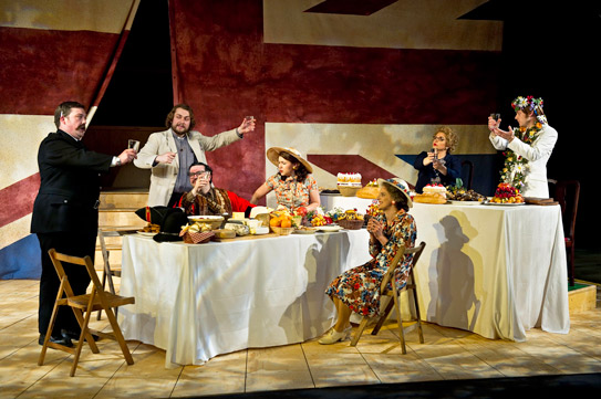 Lady Billows – Joanna Weeks Trinity College of Music Opera Company A shoal of Herrings this year! I have known and loved this masterpiece since its very earliest performances and recordings, and have seen it repeatedly here and abroad since my son was Harry in the '60s at the Guildhall School, under Vilem Tausky. The essence of Bill Bankes-Jones' concept was to make fullest use of Blackheath's Great Hall; he had produced TCM's Poulenc Carmelites in June 2007, creating an in-the-roud church-like setting there, and this year we have the whole village of Loxford in it ! Most successful was the first Act of Albert Herring, with the audience on stage behind the curtain, which opened to stun us with Ellan Parry's whole village of Loxford. From our vantage point the panorama of village life was spread below us and the acoustics for voices and Steuart Bedford's chamber orchestra was perfect; wonderful that student ensembles can now take these once-challenging scores in their stride. The only interval was between Acts One and Two. For the presentation party there was no marquee and we were down in the body of the hall as part of the general village audience. From there the acoustics were noticeably worse, and after the ceremony, not so well staged as in several other performances, we had to The cast was as good as any of the others remembered, their diction unsurpassed. All the roles were taken with assurance and high skills, putting Trinity's Opera Co right up with the competition. Regrettably there was no interval to take us through the night; a 7 o'clock start and the prescribed two intervals (as in other productions) would have served Britten & Crozier better. The hunt for Albert, feared dead, took place mostly behind the greengrocer's shop, rather out of our sight. But following his dishevelled reappearance, Albert joined us So far in 2010 we have enjoyed the immaculate traditional version at the Royal Academy of Music and the brilliantly subversive updated Paris Opera Comique production* televised by Sky Arts 2, surely soon to reappear on DVD? Still to come in London, Guildhall School 50 years on, and The Royal College of Music ! Peter Grahame Woolf May Day Committee from L-R Matthew Kellett as Superintendent Budd, Robert Trainer as Mr Gedge, Joanna Weeks as Lady Billows, *q.v. La Scena Musicale at Opera Comique Paris - - Did you ever wish that the evening you are witnessing could be recorded? It was that kind of a night - - you know that it will not likely ever be as well done - - Laurence Equilbey's reading of the score of this exceptional ensemble opera was warm and exuberant and could have not been more musically focused. See Other Herrings reviewed by Musical Pointers