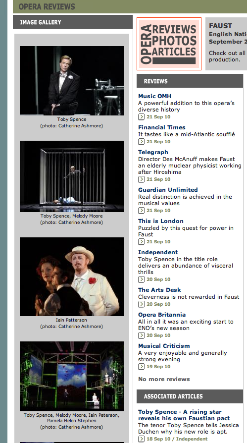 Des McAnuff’s Faust [ENO 2010] Toby Spence, Melody Moore, Iain Paterson, Benedict Nelson, Anna Grevelius & Pamela Helen Stephen Conductor Edward Gardner; Director Des McAnuff; Set Designer Robert Brill Enjoy some of the several rave reviews for this latest ENO co-production extravaganza, an undoubted commercial success, but don't ignore the wisdom from Financial Times - - The Met wins hands down from this arrangement. It gets to test its show before moving in with a superior cast. ENO is left with another hard sell. Its cast has the added disadvantage of trying to sing French music in English translation, a near-impossible task. - - We didn't warm to this latest updating of a venerable operatic war-horse, so can't offer constructive help to prospective punters who will, we guess, flock to this show here - and in New York in French, before it appears on Sky TV and DVD ? The scansion of the English words was one of the worst things about this opera-in-English super-titled version; they We enjoyed Toby Spence's singing greatly, and join the chorus of praise for his enhanced stature as a singer to fill the biggest opera houses. Not much else; Melody Moore was unalluring and vocally inadequate; Iain Patterson can't sing low... The orchestra under ENO's reliable principal conductor was fine, and we were once again charmed by the succession of good tunes in the 3rd Act, which was directed more simply. Most of the reviews and production images are collected by The Opera Critic (below, free trial membership) but one that isn't and struck a chord of fellow feeling with us is a blogger's description incuding how '- - a huge video image of Toby Spence’s disembodied head reminded me of Old Star Trek, when they often had big alien heads appear on the screen in similar manner, to bellow threateningly at the brave crew. Later on, Melody Moore’s huge disembodied head was projected in the same manner, but this was even better, because there was the sci-fi set to go with it. Yes, no stuffy old alchemist’s den for Dr Faust, for this was more Dr Atomic in a chrome and white 20th century lab with beakers of chemicals and model bombs and people in white coats and stuff - - For a corrective, try Murnau's version... Peter Grahame Woolf