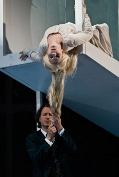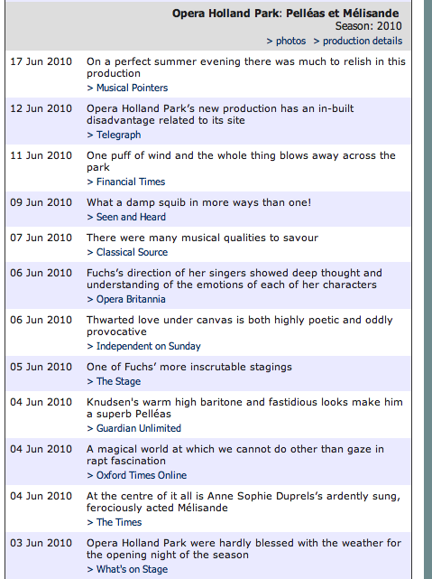 Olivia Fuchs Holland Park Theatre, Kensington, London 16 June 2010 On a perfect summer evening there was much to relish in this production, which had an unfortunate premiere in dreadful weather conditions - but even on a fine day you need to be prepared for it to get cold before the end. Leaving aside the sillinesses of the staging - wobbly platform, like one of those physio balance training apparatuses; perilously steep walkway for aged Arkel, etc, I would like to concentrate on a few positives. I had no problem with Yannis Thavoris' general abstraction of design, and a few scenes were staged to perfection, especially in Act 3. Having ridiculed Tosca's back-flip suicide at ENO, we admired Olivia Fuchs' way to make Mélisande's hair fall to just within Pelléas's reach. The following sequence between Golaud & Pelléas was riveting, but the spell was completely broken by the grotesque miscasting of an oversized Yniold (was Louis Watkins in two earler performances more convincing?). There must be many boy singers in London who could have filled the bill more suitably? Alan Opie's horrific descent into paranoia, wife beater and fratricidal maniac was duly gripping, but I was Which leaves final comments about the scene shifters who intruded on the action as Those were intended to serve as visual pauses for contemplation between his chosen Maeterlinck scenes, set one note to a syllable in a "continuous, fluid cantilena, somewhere between chant and recitative". I doubt that an Opera Holland Park audience is incapable of listening to those interludes without distracting stage action? There are two good reasons why they should have been allowed to try; first, an opportunity to watch and admire the magnificent orchestra which sounded better being not hidden in an opera pit as usual. The score of Pelléas et Mélisande is one that never palls on repeated hearing [q.v. - - the magic of the opera exerted its incomparable power over me once again Telegraph] Overall, this was a thought-provoking evening at the opera, one we were glad not to have missed. Peter Grahame Woolf See the many reviews collected on The Opera Critic (free trial membership available):