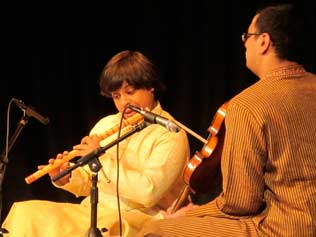 SHASHANK AND SIRISHA SHASHANK with Balu Raguraman (Violin) & Phalgun (mridangam) Bhavan Centre, West Kensington, 10 October 2010 A strong husband/wife team shared this splendid evening at the Bhavan. Shashank Subramanium, first encountered at Darbar 2009, has developed into maybe the leading Indian bansuri flutist. The artists were introduced by their comprehensive CVs, but there was no help with the actual music to be heard. Shashank announced his items in a way which was not intelligible to uninitiated Westerners amongst his audience; we were even encouraged to choose ragas we would like to hear, underlining that Indian classical music making is largely improvised. For most of an hour and a half Shashank demonstrated his virtuosity on flutes of two sizes, incorporating newly developed techniques of "multi flute transposed fingering" and "dual octave production" which we had to take on trust. Tireless in his enthusiasm and energy, he seemed reluctant to finish his set, which began very late and overran his allotted time, concluding with an extra "simple piece" which was far from simple ! He was ably accompanied by Balu Raguraman, a distinguished teacher at Bhavan, shadowing Shashank's phrases on violin and interposing mellifluous short solos (non-vibrato - link with baroque string-playing !) and by Parapulli Phalgun, a discreet percussionist who gave pleasure on the mridangam, without indulging in the competitive virtuosity which is sometimes a notable component of these concerts. There was no tanpura; just a "drone box" I presume, though I couldn't see it. Shirisha Shankank introduced her solo dances charmingly, illustrating for us details of the mimed story-telling, one of them about a sometimes naughty little boy whose mother did not realise that he was the God Shiva... From a Chenai review I learned that Sirisha Shashank is 'a fine, complete dancer and also an accomplished vocalist, all set to win fame for herself in her own right and steal the thunder from her husband'. This confirmed my suspicion that the recorded accompaniment, about which we were told nothing, featured her husband on flute, but I was unprepared to learn that the singing was by the dancer herself ! As at our last visit to Bhavan, we found that music followed by dance made for an excellent entertainment. The sound quality as transmitted to us this evening was relatively free of the distortion which sometimes bedevils Indian classical music concerts, nor was it generally overloud, though some notes burst out disproportionately. But one still regretted the forest of conspicuous microphones on stage and being deprived of the possibility to hear Shashank's bamboo flutes in their acoustic purity, so that a Western concertgoer might put them in context with the familiar baroque flutes and and recorders which we are used to hearing unamplified; this the more so since the smallish audience was encouraged to come to the front block of six rows of seats, where most of us could have been accommodated. I have been assured by Bhavan's adminstrative manager that "Although I sympathise with your 'no amplification' campaign, I am afraid it would take a long time to persuade the musicians That stance is incomprehensible, given that next morning, putting one of Shashank's newest discs onto our player, we were confronted with the gentle purity of his bansuri's 'scintillating, primal tones - - the most organic and ancient of all instruments' in perfection. Shashank has released over 50 CDs and two DVDs. His Sundara DVD is beautifully filmed and recorded, and it offers, for a modest £8, the incontrovertible proof of the reasonableness of my campaign to help persuade Western music-lovers not to sideline the beauties of Indian music live in the convivial atmosphere of London's Bhavan Centre. Peter Grahame Woolf * Response 13 Oct 2010