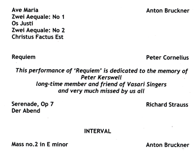 The Sixteen/Harry Christophers (Monteverdi's Selva Morale e Spirituale at Temple Church) were the crack amateur Vasari Singers, Jeremy Backhouse's 40 fully a match for Christophers' augmented 16. The Vasais sounded magnificent at St Martin's. To my ears, the most compact of Bruckner's Masses is all the better for its relative concentration and for being without soloists to steal the limelight. A favourite of mine over long years, but rarely met with in concert, this was the finest account of it I can remember. The Sixteen's concert was broadcast by BBCR3; this one from the Vasaris, whom we have reviewed often, could make a fine CD (or DVD !) and should, at the very least, be repeated for radio? Peter Grahame Woolf