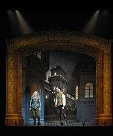 Quadcast: 23 February 2011 with a live broadcast on Sky Arts 2 (HD), Sky 3D and live into selected cinemas in 3D around the UK and a deferred relay in 2D into selected cinemas internationally. The fourth element of the ‘quadcast’, onto Sky Arts 1, is directed by Mike Figgis. Another flawed offering from ENO in its bid to appeal to the contemporary young who are resistive to opera. There are saving graces to this conflation, but those only became evident to us on the way home, studying contributions to the programme book (£5, will those new opera goers have afforded it?) from Roger Parker on the opera and Edward Seckerson on Mike Figgis' contributions; some of the latter will presumably find their way onto the TV transmissions (listen to them talking on line). The opera (1833) was originally more innovatory in conception than might be immediately obvious; with bel canto vocal display sparing, especially for Lucrezia herself. The traditional costuming at ENO was a welcome relief, but incongruous with Paul Daniels' naff translation into "today talk". As conductor, Daniels did well with what is really a light score for a dark subject, and so did all the lead singers listed above. The minimalist staging was designed with considerable subtlety by Es Devlin, with some references to classic pictures easy to miss. The chorus, with precise "minimalistic movements" functioned like a classic Greek chorus, outside the main action. Was the budget lower than for ENO's recent extravagances? Most of the sets, small sub-stages constructed with proscenium frames and footlights [illustration above] would do Figgis' film, in Italian with subtitles, is full of sex/violence titillation, and will presumably be shown on TV broken up in sections, as at the Coliseum; it just does not mix with the opera. Peter Grahame Woolf P.S. Having seen the Sky Arts 2 transmission this week on a good TV home cinema set up (but not 3D) I am pleased to say that it all translates to screen well, and with excellent camera management, the production on Devln's sets looks fine. The soloists are seen and heard clearly (without subtitles) to good advantage and some of Figges' film interludes are a little less jarring without seeing them put up on the opera house screen with the orchestra visibly doing nothing... It does convince me that the choice of this opera for such wide distribution was a canny one, and I wish it well in its commercial future...
