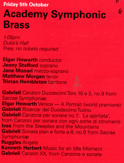 G Gabrieli, Howarth, Ives Academy Symphonic Brass/Elgar Howarth/Mark David RAM, Duke's Hall, 5 October 2012 A splendidly conceived and presented showcase for the Royal Academy of Music's Brass Department, one that has the makings of a future CD (better a DVD, but film cameras were not in evidence). Gabrieli Canzoni etc are the backbone for brass consorts (whether modern or period) and several of them bookended and punctuated this concert. Of "contemporary" music, Ives' From the Steeples and the Mountains for brass and bells (1901 !) was the most radical... Howarth's commission for this concert eschewed poetry for Venice - A Portrait a concert work with four singers illustrating the importance of A muster of schoolchildren, many of them brass students, some quite small, filled the Gallery with admirable decorum and involved appreciative listening. Peter Grahame Woolf