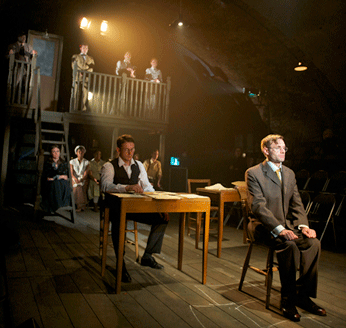 Alastair Brookshaw [L&R] Southwark Playhouse, London 27 August 2011 This musical (1998), bookended with Confederate Memorial Day parades to start and finish, is based on the real murder of 13-year old Mary Phagan in Altanta 1913, for which a Jewish factory manager Leo Frank, an outsider in Georgia, was blamed, convicted, abducted from prison and lynched. Given in Southwark's vaulted theatre (under a Victorian railway arch) and played on a long, narrow action space, between the audience at close quarters either side, the impact of this piece about hysterical anti-Semitism in Georgia a century ago was overwhelming, lacking nothing on account of the minimal staging - as big a contrast with a typical American musical in a large theatre as you could imagine. At such close quarters, one could admire the smooth and persuasive production of Thom Southerland and his cast, every member of which was wholly in character throughout (even doubling some of the parts). I even regretted that it moved too swiftly to allow for applause after some of the best numbers. A pity that the authors resorted to Confederate anti-black prejudice, as a last moment "explanation" of a murder mystery which, in actuality, was never solved; the real Leo Frank was granted a posthumous pardon in 1986. This was a show for which we were lucky not to have read the programme synopsis until afterwards, so we were in tenterhooks wondering how the second Act would resolve. No weakneses in the cast. And the music was projected under Michael Bradley's persuasive direction (the cast could see him guide the tempo and maintain momentum on video monitors) and they achieved good sound balance by the end of the first week, when we saw it, engineered by Theo Holloway at just the right volume [q.v. Controversial reviews & opinions *]. Recommended wholeheartedly, even to readers who have supported our long running campaign against excessive amplification, particularly for Indian Classical Music, still often given with "inevitable over-amplification - - even bordering on the pain threshold!", which alienates British concert audiences. Peter Grahame Woolf * q.v. Controversial reviews & opinions upon the first night - ** to ***** -