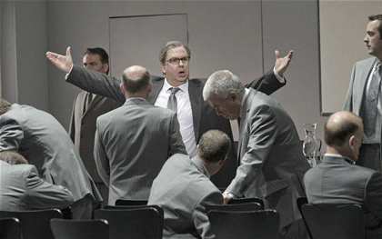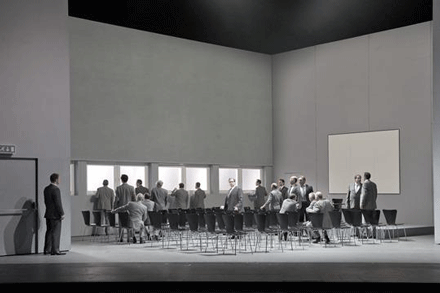 Close your eyes, and you might enjoy it. You’ll avoid seeing the silly toy paper hat Boccanegra has to put on in his death scene too. FT **- - is it Genoa? Verdi’s music speaks of the sea. The libretto is full of maritime references. Boccanegra himself is a “pirate”. There’s ne’er a whiff of this in Tcherniakov’s sterile interiors - - ** Alexa Woolf, having read the ending quite differently, comments that "Tcherniakov does not present Simon(e)'s death melodramatically, but as a sublimely poetic and moving event overtaking him. As the poison takes hold - "even the water tastes bitter" - we see him gradually retreat from life, regressing into his youthful seafaring past as a pirate. Childlike, he plays with a folded paper boat waving it in the air as if gently rocking on water, then donning it onto his own head... His calls for his beloved wife/daughter Maria are poignantly unheard. real contact seems no longer possible and he drifts out through the door separating life (Tcheniakov's "boardroom") to death, vanishing as if losing consciousness... |