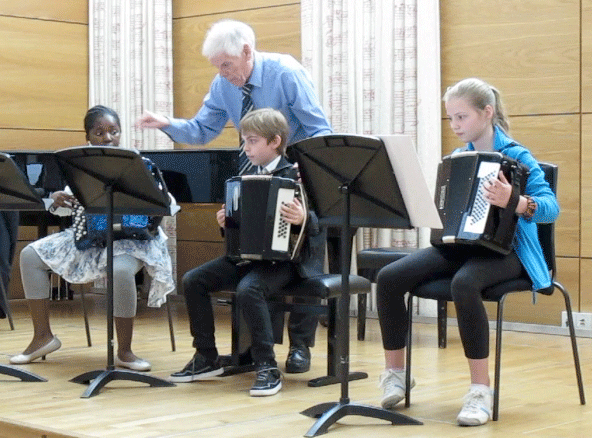 The major theme of Prof. Owen Murray’s celebration of 25 years building up the Accordion Department at the Royal Academy of Music to national renown was accordion teaching. His special guest for the occasion was Lars Holm, an accordion teacher from Sweden, well known throughout the world from Denmark to Reykjavik, from Rio de Janeiro to Tokyo and many other places. Holms’ great talent lies in his infectious enthusiasm for teaching young children. He has developed several teaching books for beginners to play small free bass button accordions. Practice for young children must above all, he say, be made fun. He demonstrated this by accompanying children with simple folk tunes whilst they played beginners exercises. Murray and Holms developed a strong case for starting children with a small three row free bass button accordion. Such a small instrument can be handled by a young child when properly held, without any appearance of clumsiness. ‘Whilst I teach students with piano/C system free bass, piano/B system free bass and chromatic button with either C or B systems ‘ says Owen Murray ‘my preference is for a button C system in both hands. If children start this way, when they progress to a larger convertor instrument the standard bass system is very easily mastered and there is no difficulty with co-ordination.’ Both Owen Murray [R] and Lars Holm [below L] gave demonstrations with a number of young people who appeared to enjoy themselves very much, both playing solo and playing together.