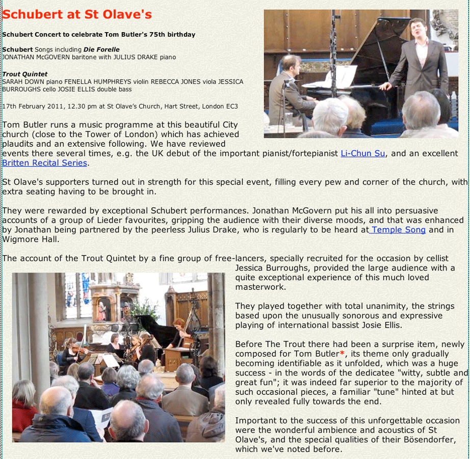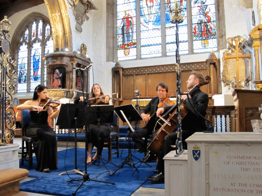 Haydn, Mozart & Britten The Badke Quartet St Olave's Church, Hart Street, London 18 July 2012 Thomas Butler [L] with his successor Michael Gammie This notable recital marked the retirement of Thomas Butler as curator of the distinguished series of St Olave's recitals since 2002, with previous involvement back to the late 1990s. String quartets of Haydn (Op 20/4), Mozart (K. 590) and Britten (No. 3) made an ideal programme for the occasion. The Badke's playing was intense, with good rapport between the musicians, who had The classical masterworks were slightly compromised by the leader's strident metal e-string; maybe she should think about gut strings and a different violin for their early repertoire? The Britten (composed in Venice when Britten was already very ill, and introduced interestingly by the cellist, a good communicator) was especially rewarding heard live. This was as involving an account of it as I can remember. Peter Grahame Woolf See the Badkes play Tomkins Sad Pavan for these distracted times
