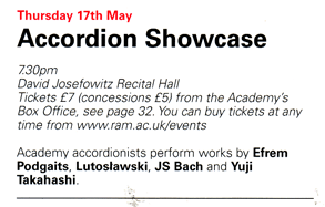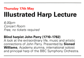 A magnificent evening of instruction and entertainment at RAM, London. Sioned Williams entranced harp students and public visitors who'd never heard of the great Parry. She read her paper, but in so lively a manner you'd never think so, with a Welsh intonation and, too, a few readings in musical Welsh... The event was hugely enhanced with a visual commentary on screen provided by her husband, an exemplary use of technology. This lecture/recital would make a splendid video/DVD. Straight on to an accordions spectacular (mostly Piginis) with Some of them in this year's showcase are very young - all excelled in Scarlatti to Piazzolla and Lutoslawski (duos with Unfortunately no photos were allowed of either of these most photogenic of instruments, to the surprise and disappointment of some of the students and of the Professor ... Maybe RAM will relent for an important all-day accordions event next month, the Accordion Department's 25th Anniversary Celebration Sunday June 10th? Peter Grahame Woolf