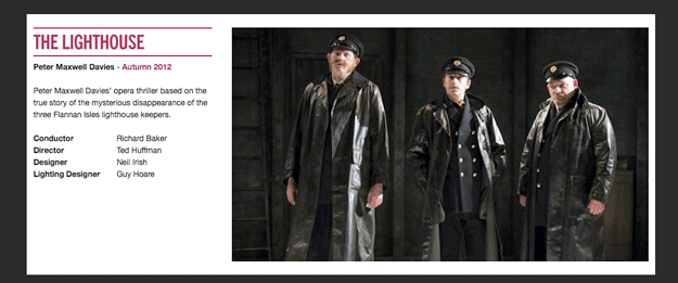 The Lighthouse Libretto & music by English Touring Opera Linbury Studio, Royal Opera House London, 11 October 2012 Photo: Alastair Muir A stunning perormance of this great chamber opera, underpinned by the superb Aurora Orchestra under Richard Baker. It all gelled together and we were able to watch the whole libretto on side panels (c.f. Albert Herring; surtitles are to be provided when that production goes on tour, I was told). A clever little touch was that when one of the keepers went up briefly to deal with the light, he became hard for us to hear - and the side-titles failed too... The prologue - an Enquiry about the disappearance of three lighthouse keepers, based on a true incident - has "difficult" modernist music, but attention is held by the dialogue, ostensibly by "relief" service employees who had eventually arrived to find "everything shipshape and in good order" as they testified... but no lighthouse men... After the interval it gets easier musically,spiced with a lot of "character" music with exotic instruments - guitar, crotales, flexatone, out of tune piano; a sing-song from the three beleagured lighthouse men eventually turning very nasty indeed. All three singers characterised their main roles strongly and held attention as their relationships soured from fractious to worse. The resolution is a brief epilogue, even nastier, and the whole was a memorable Peter Grahame Woolf P.S. Reviews: The Telegraph gives away too much... So no link! Best: Mark Berry in Seen&Heard.