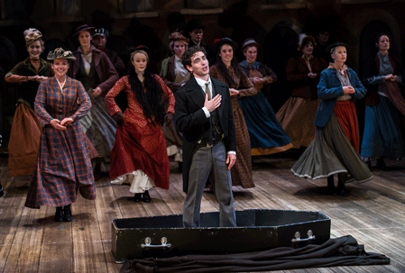 End of Year Musicals at three London Colleges, June 2012 Chaplin at Guildhall School of Music & Drama This was a lavish production, of fully professional quality. Voices were not all fully developed, but the necessary amplification usual with musicals was managed skilfully. The show itself (Broadway, 1980s) has its longuers and is not really likely to be viable commercially now. The musical score (Roger Anderson) is routine, the tunes unmemorable, but it was all well put over by the cast and GSMD Orchestra under Steven Edis. Simon Blackhall [pictured below] had an impossible task representing the early development of the Charlie we all love. Most impressive was the design, exploiting the full width of the large stage, with videos and clever props (e.g. a liner funnel to represent the journey to USA and Mack Sennet...). Best were the group numbers with confident movement and lusty singing: Photo Clive Barda