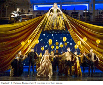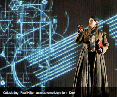 Albarn & Norris Dr Dee Opera in two acts English National Opera/Stephen Higgins John Dee – Paul Hilton Katherine – Anna Dennis Kelley / Bishop – Christopher Robson Walsingham – Steven Page Elizabeth I / Spirit – Melanie Pappenheim Young Dee – Rebecca Sutherland Young Katherine – Victoria Cooper Jane – Clemmie Sveaas Ensemble: Damon Albarn (vocals / guitar / harmonium), Anne Allen (reeds / recorders). Tony Allen (drums), Liam Byrne (viol), Mamadou Diabate (kora), David Hatcher (reeds / recorders / viols), Arngeir Hauksson (lute / hurdy-gurdy / William Lyons (reeds / recorders) & Mike Smith (keyboards) Orchestra of Damon Albarn – Co-creator & composer Rufus Norris – Co-creator & director Paul Atkinson – Set designer Katrina Lindsay – Costume designer Paule Constable – Lighting designer The Coliseum, London - - it’s all about the spectacle, on the stage and above it Standard Firmly characterised by ENO as an opera, this is perhaps better placed on the recent Musical Pointers page with a batch of varied musicals. More interesting for its visual extravagances than the music, it made for a rather exciting experience in the opera house, though my interest waned with the repetition of special effects in the second act. Those included stunning lighting (Paule Constable) and illusionistic videos on The live raven earned some of the loudest applause ! Despite all that, the rise & fall of Dr Dee in the Elizabethan Court was fatally undermined by the decision to deny us ENO's hard won acceptance of the essential need of surtitles for Opera in English [* c.f. above, Trinity Opera's bizarre decision to deny us even a synopsis, let alone surtitles for The Secret Garden !]. With 95% of the words indecipherable, the interesting story line went for nothing, and we were left with spectacle and intermittently interesting music. Amplification was decently done in general, but took out the character of the early and ethnic Peter Grahame Woolf